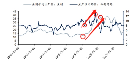 生猪价格方面:鸡肉作为猪肉、牛羊肉的替代品,与猪肉价格具有较强的联动性。2019 年起猪肉价格猛涨,鸡肉的替代性作用逐渐凸显,需求暴涨。